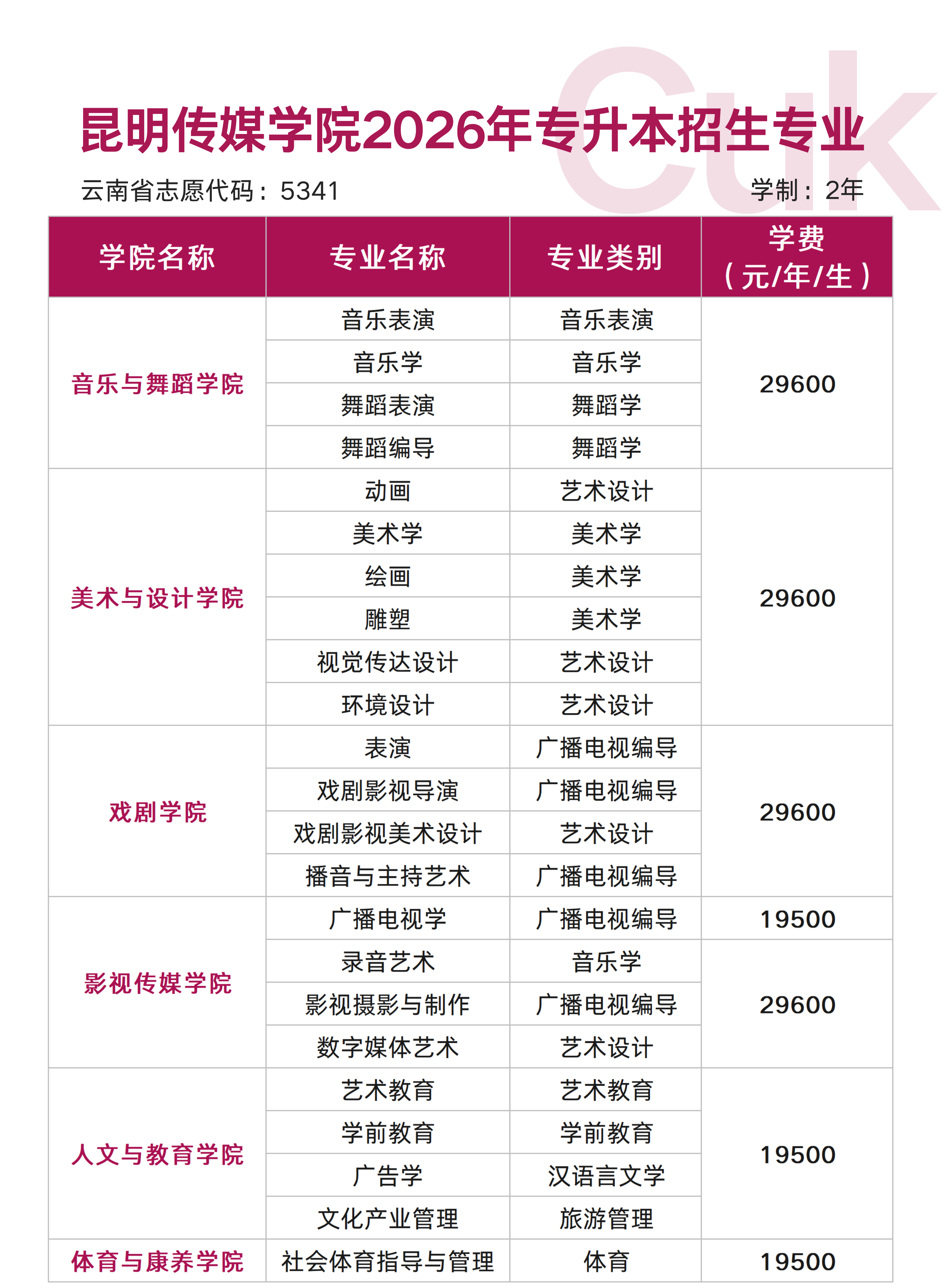 昆明传媒学院2026年专升本招生专业对应专科专业对照表